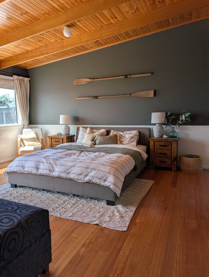 Old Salty Shack is a relaxed, character-filled retreat perched above the beach in Binalong Bay. Designed with simplicity and comfort in mind, the shack features an open-plan living area that flows into a separate guest wing with two bedrooms and a bathroom, perfect for families or friends travelling together. This wing can be closed off for privacy, while the spacious parents’ retreat offers a quiet sanctuary with its own ensuite and room to unwind.